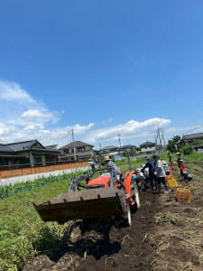 理事長さんが機械で掘り起こしたじゃがいもを拾ってコンテナに